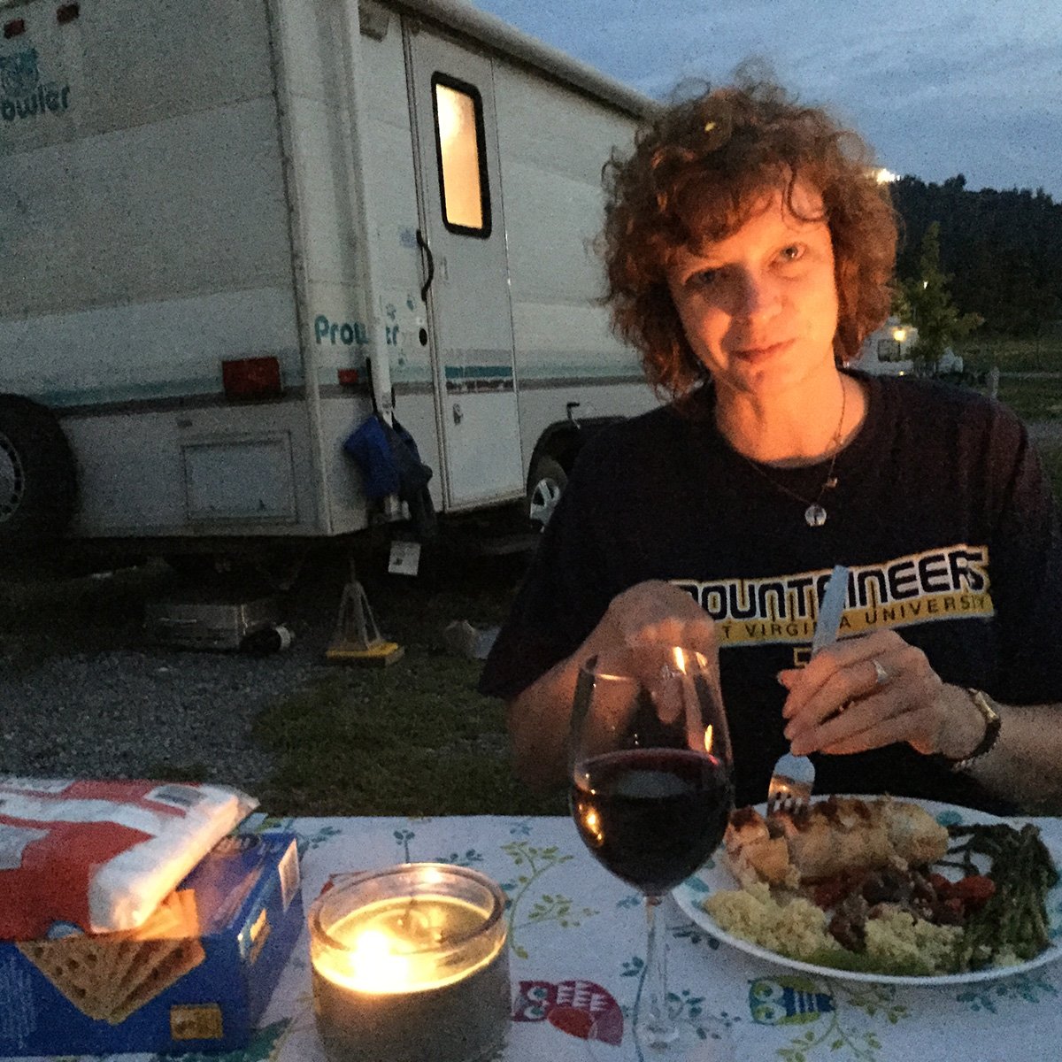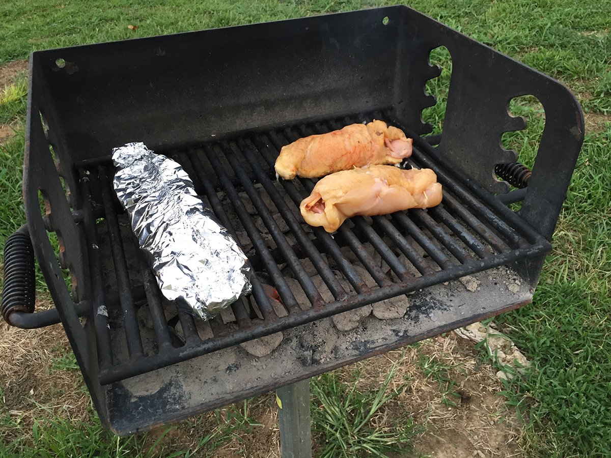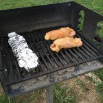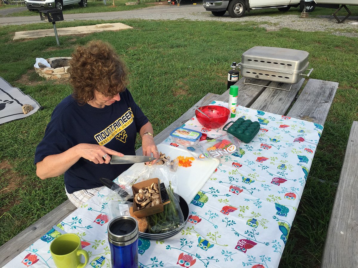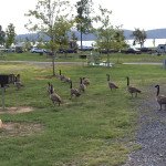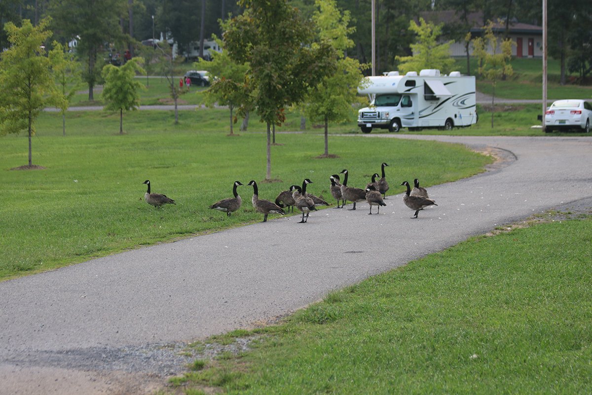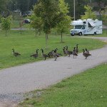 Day 2: The next morning we were greeted by geese. They were everywhere by the hundreds. We took a quick trip up the road to see more deer (we saw a couple the first day). Came back and ate some egg sandwiches cooked on our campers range. Took a shower in our very “spacious” shower. Ok, it shares the space with the toilet, but it saves time in the morning! We spent the rest of the day walking around the park – as much as we could anyway, since Roberta had a bad knee this trip. She normally love hiking and exploring, so that bummed her out a bit, but we made the best of it. For lunch we cooked turkey burgers on the grill. For dinner, we got a little carried away. Hey, we like to cook, so being away and camping, makes no difference to us… we are GOING to COOK! We made chicken breasts stuffed with ham and cheese, asparagus and tomatoes and mushrooms. Couscous on the stove top, but the rest on the campsites charcoal grill. I’m used to gas, so it took a bit longer and we were very hungry, but it eventually came time to dive in. Maybe being starving and half a large bottle of wine helped, but it sure was great. The company, the fresh air, the cool-ish night, I don’t think I could have asked for a better first trip.