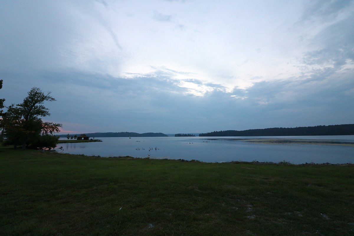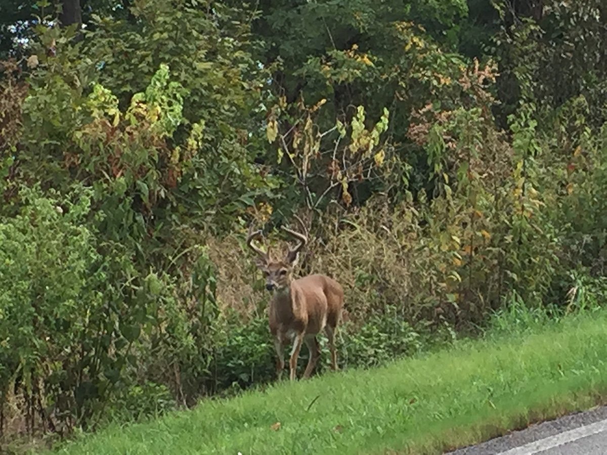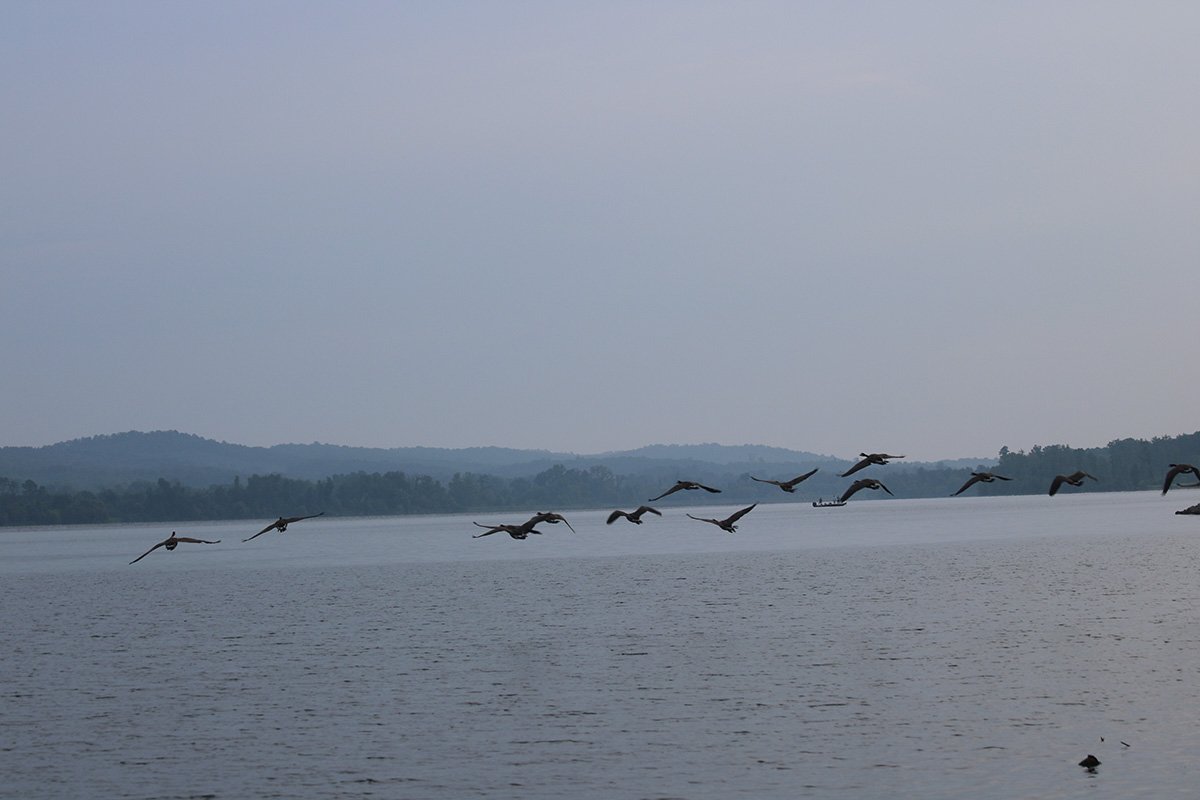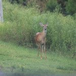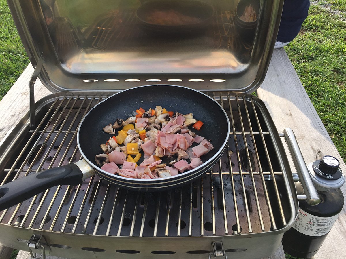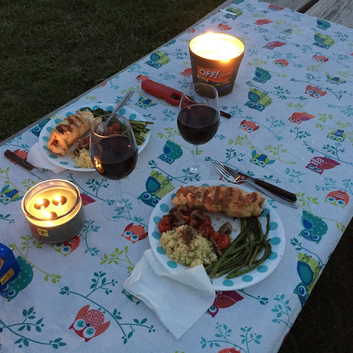 Day 2: The next morning we were greeted by geese. They were everywhere by the hundreds. We took a quick trip up the road to see more deer (we saw a couple the first day). Came back and ate some egg sandwiches cooked on our campers range. Took a shower in our very “spacious” shower. Ok, it shares the space with the toilet, but it saves time in the morning! We spent the rest of the day walking around the park – as much as we could anyway, since Roberta had a bad knee this trip. She normally love hiking and exploring, so that bummed her out a bit, but we made the best of it. For lunch we cooked turkey burgers on the grill. For dinner, we got a little carried away. Hey, we like to cook, so being away and camping, makes no difference to us… we are GOING to COOK! We made chicken breasts stuffed with ham and cheese, asparagus and tomatoes and mushrooms. Couscous on the stove top, but the rest on the campsites charcoal grill. I’m used to gas, so it took a bit longer and we were very hungry, but it eventually came time to dive in. Maybe being starving and half a large bottle of wine helped, but it sure was great. The company, the fresh air, the cool-ish night, I don’t think I could have asked for a better first trip.